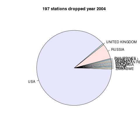 It clearly consisted of a few major culling events. In the next table, the years with more than 100 stations ending are shown with a breakdown by country:
