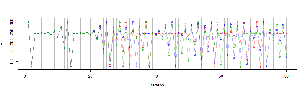 But the recurrence does, for large parameter, generate a chaotic sequence which has useful analogies to waether, climate and their emulation. Here is a plot of part of that sequence. The green, red and blue points are initially separated by a distance of 0.0001 K. The recurrence starts at T0=300K, and follows the sequence